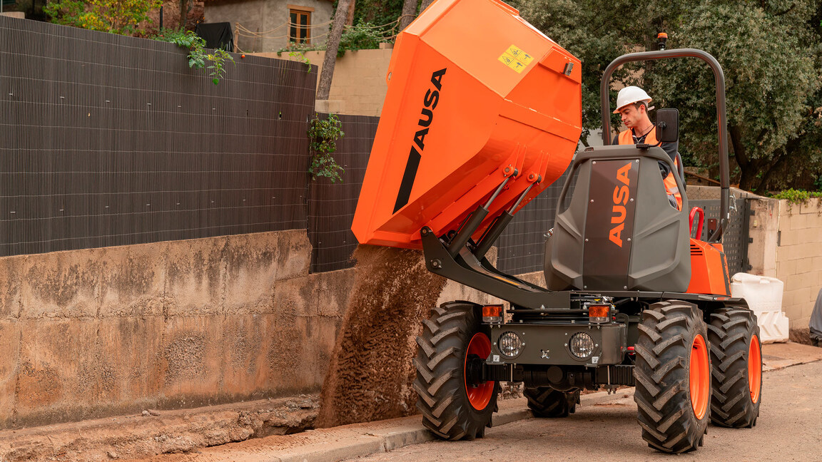 D151AHG The D151AHG is a versatile dumper with a 1,500-kg (3,300 lb) payload capacity and a swivel skip, making it ideal for comfortably unloading materials into side ditches. Its compact size is perfect for small public works projects and areas with difficult access. Additionally, the permanent 4-wheel drive ensures it can handle even the toughest terrains. To simplify maintenance and minimize downtime, this dumper features a tilting driving position, providing excellent access to the engine and components.